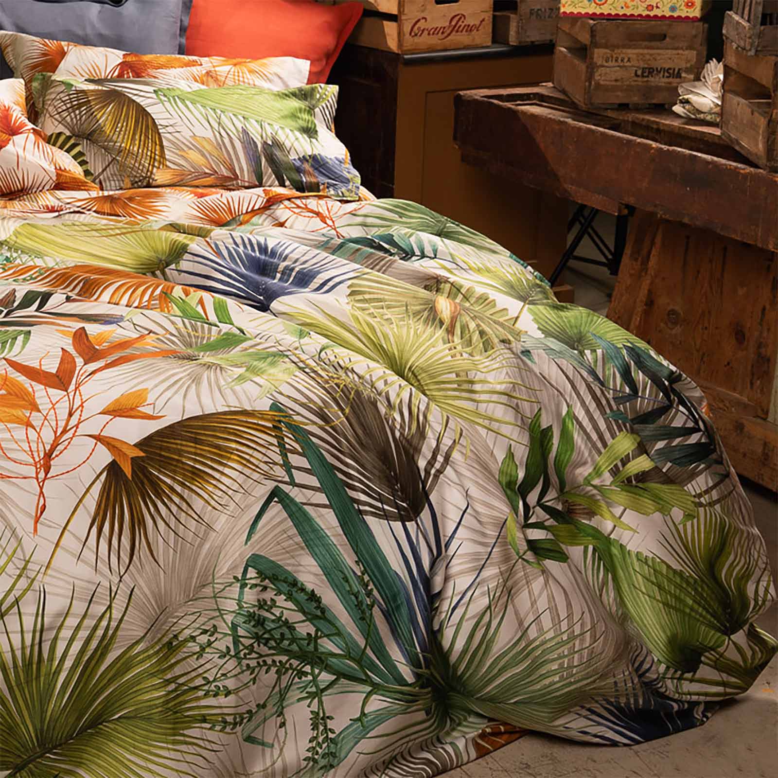 - Tessitura Toscana Telerie ha invece pensato alla collezione PALMERAIE con la quale vuole riportare, nelle nostre camere da letto, l’atmosfera tropicale di queste rigogliose piante perenni. L’arancio ed il marrone si mescolano alle diverse sfumature di verde dando vita ad un design unico e contemporaneo.