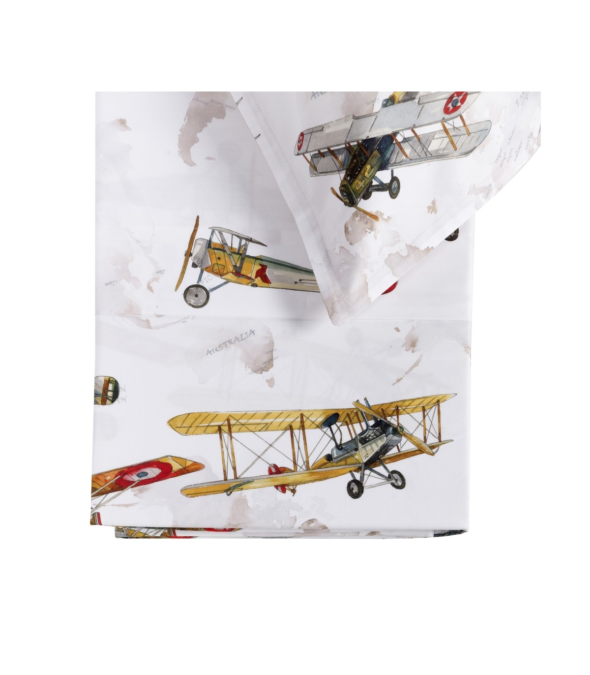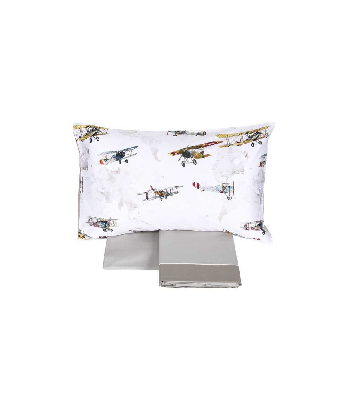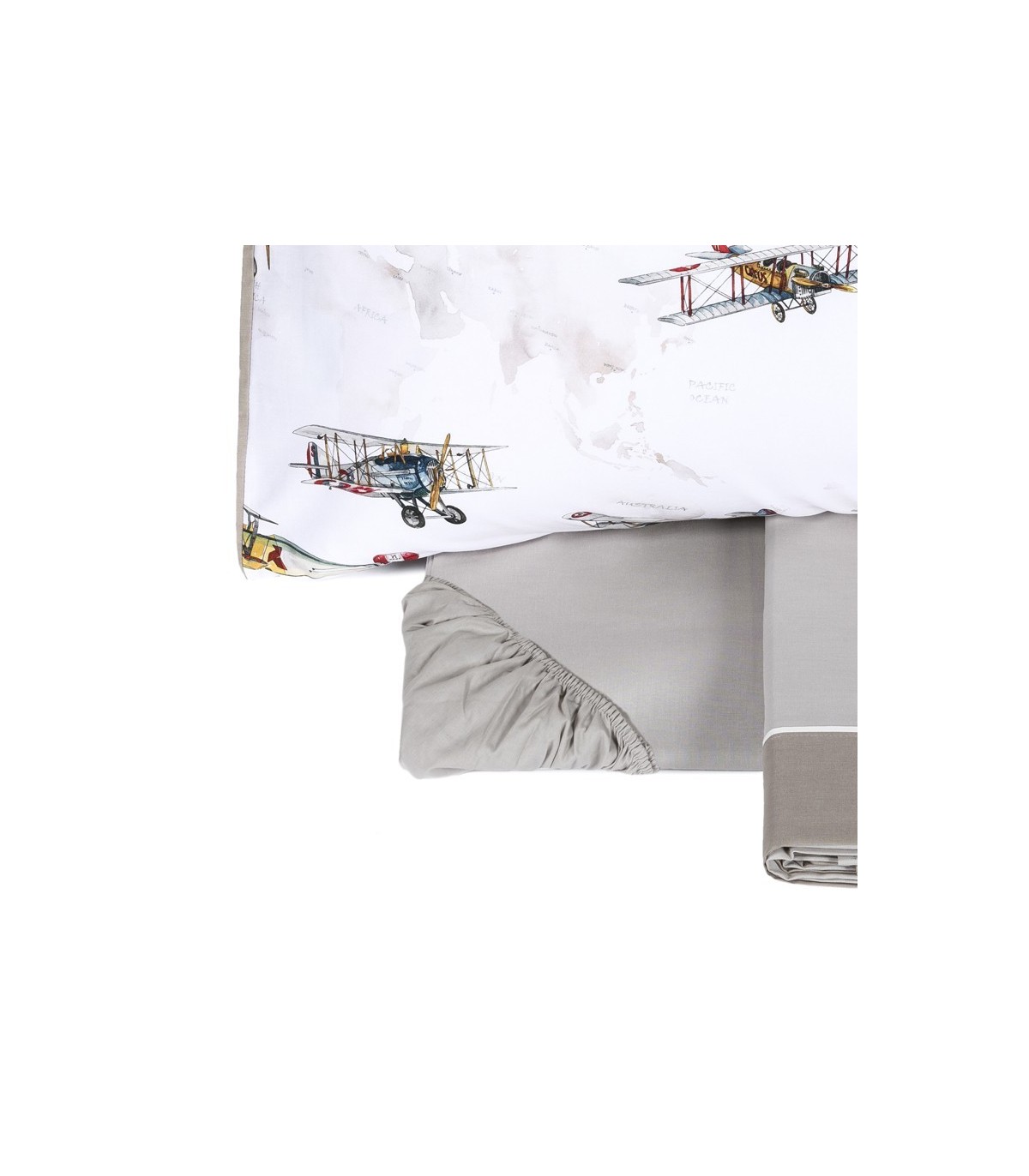 Completo lenzuolo singolo stampato con balza applicata per un effetto copriletto. Lenzuolo di sotto con angoli in tinta unita e federa stampata. Made in Italy