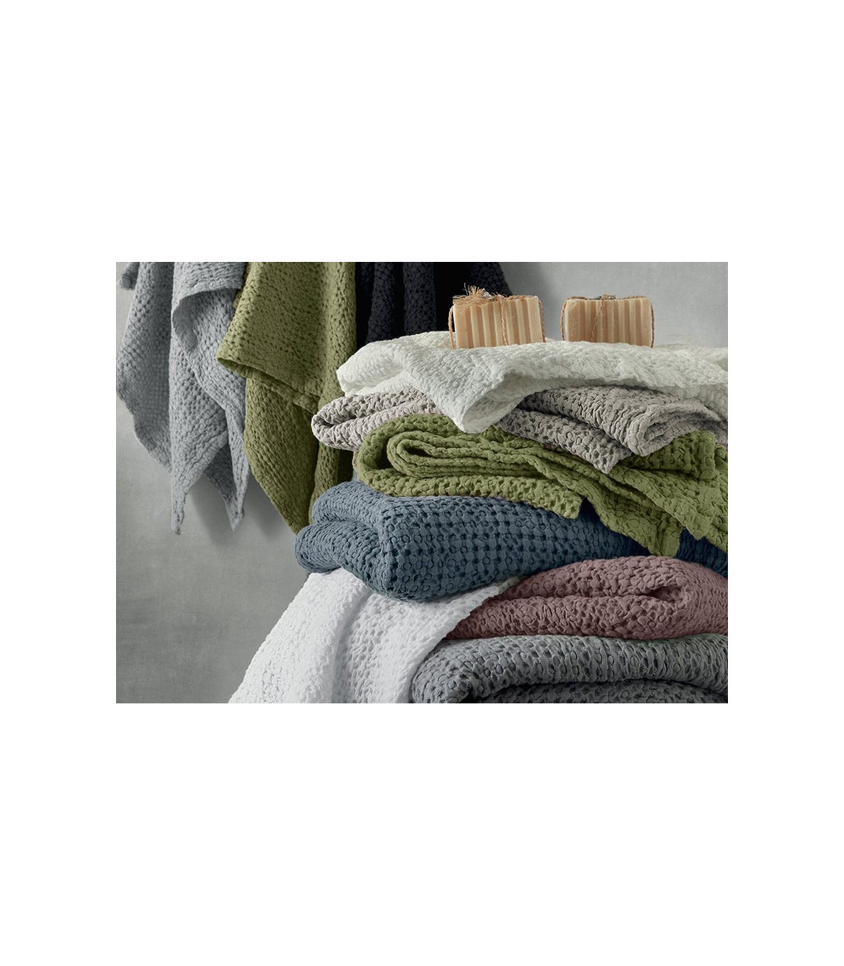 Nido d'ape, in puro cotone idrofilo, tinto in capo, effetto stropicciato.