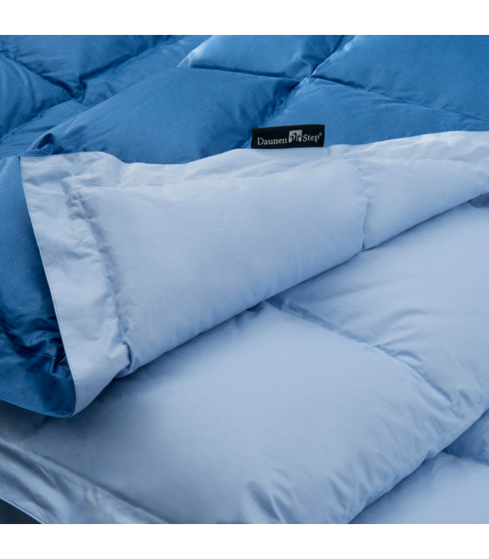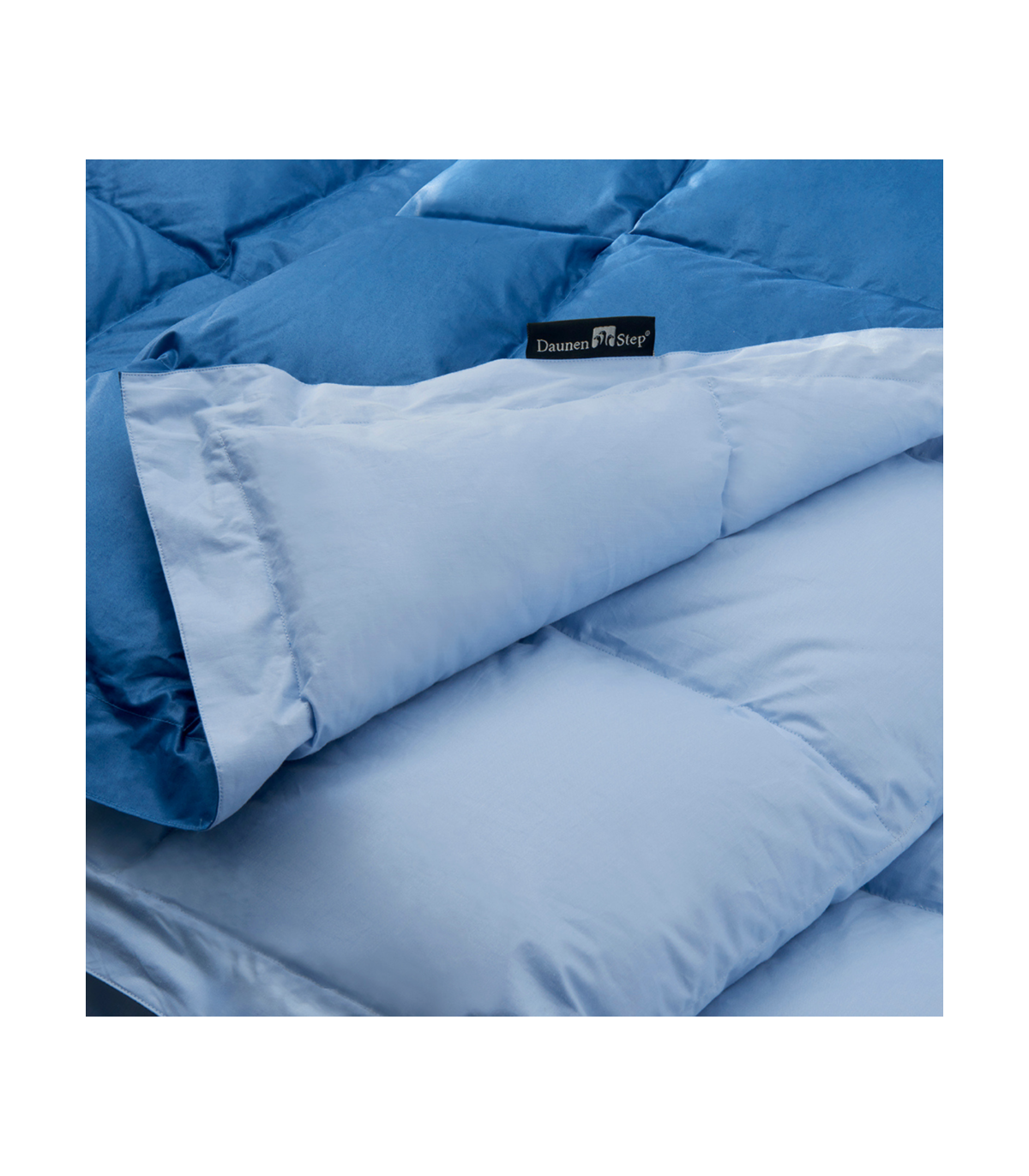 Trapunta bicolore in piuma d'oca, l'imbottitura 90% piumino e 10% piumetta e rivestita in morbido cotone che regala un confortevole e rigenerante riposo, adatto anche per chi soffre di allergia, essendo certificato anti-acaro.
