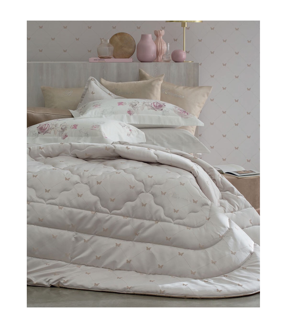 Trapunta matrimoniale in jacquard tinto in filo con logo Blumarine in cristalli.