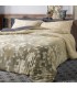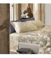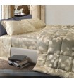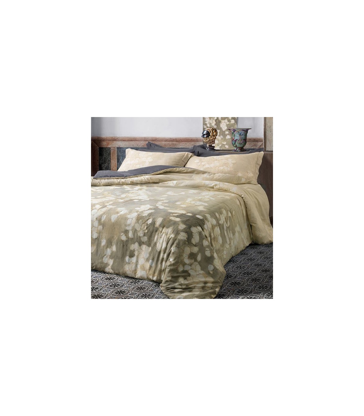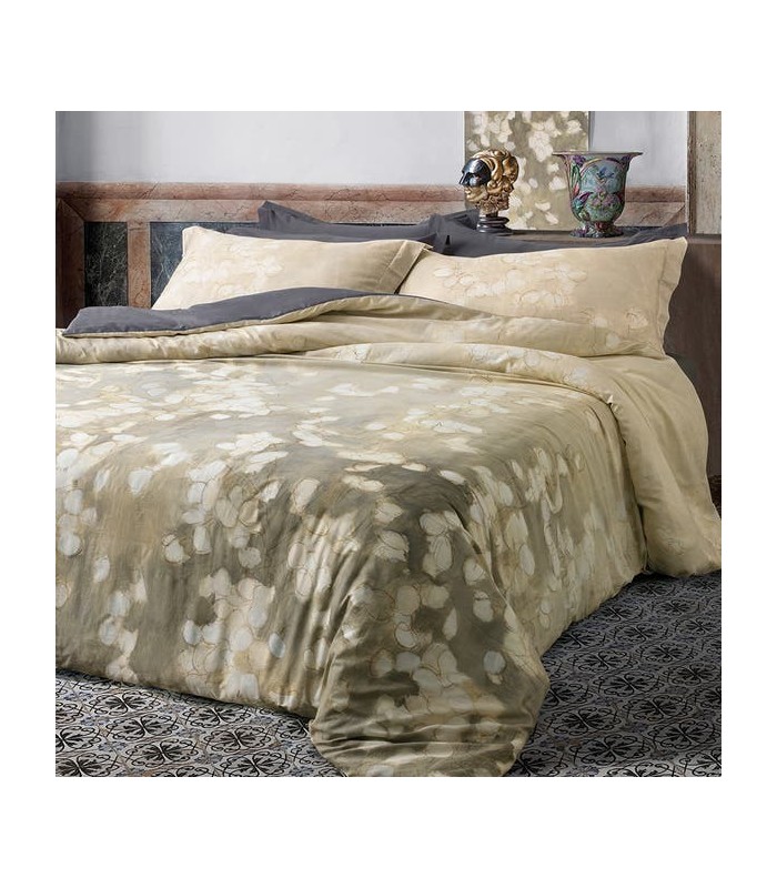 Completo copripiumino matrimoniale, tinto e stampato su puro raso di cotone mercerizzato 120 fili/cmq. Composto da sacco copripiumino in raso stampato nella parte sopra e tinta unita sotto. coppia di federe stampate e rifinite a tre volani e sottolenzuolo con angoli in tinta unita. Made in Italy