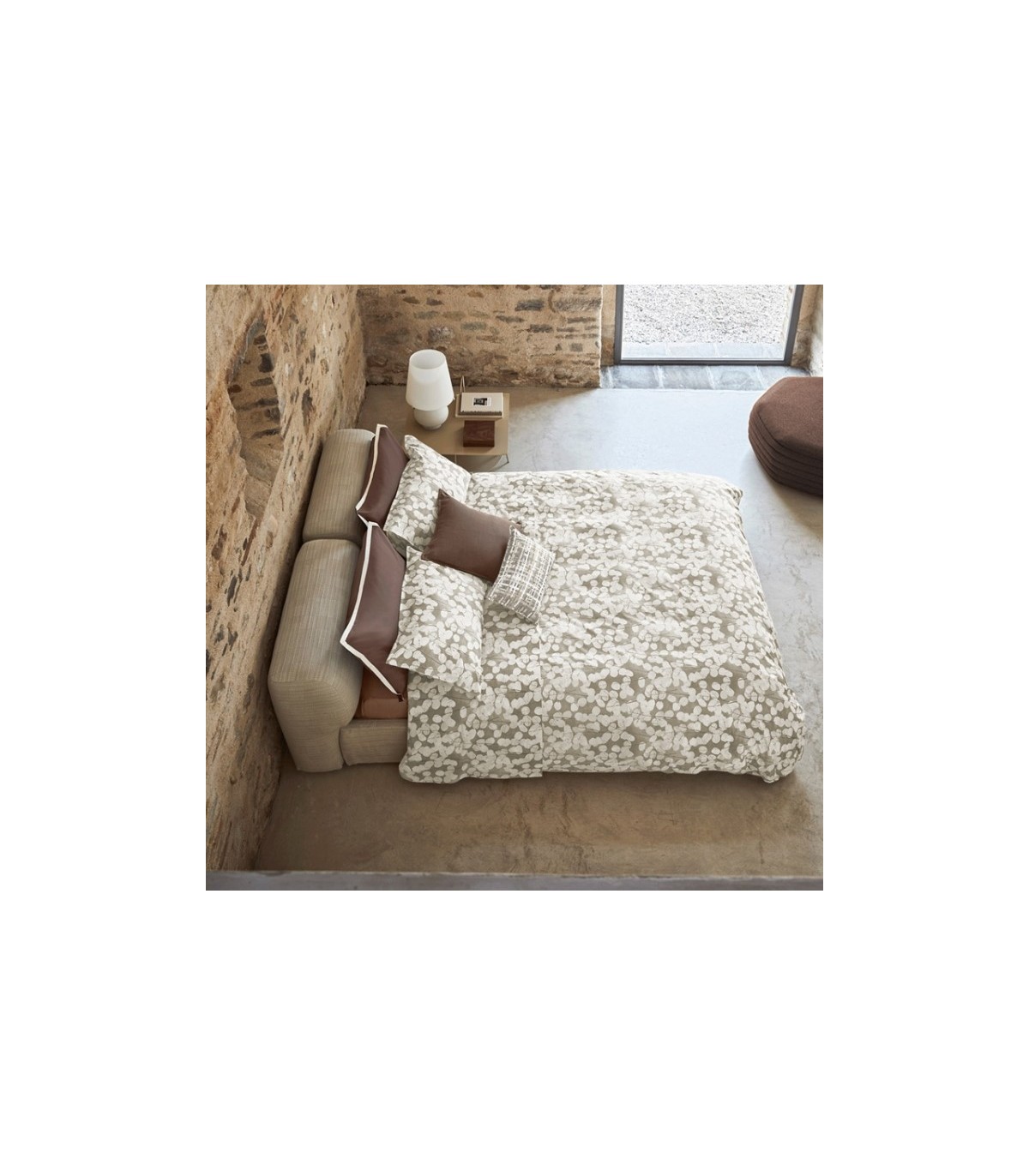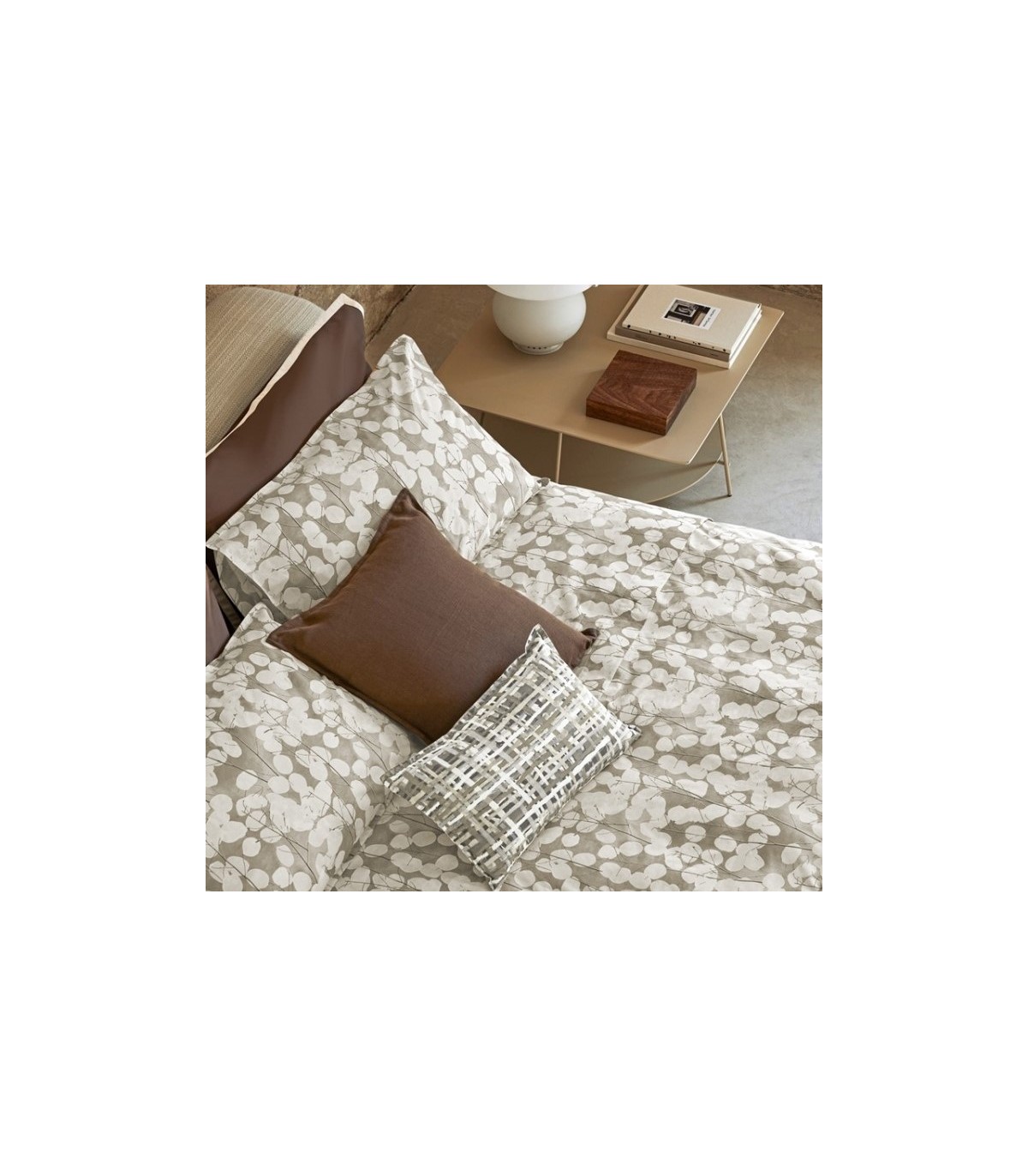 Parure copripiumino matrimoniale, in percalle di puro cotone. La faccia superiore del sacco e delle federe è in raso 300 TC di puro cotone stampato in digitale, l'altra faccia è in tinta unita. Made in Italy