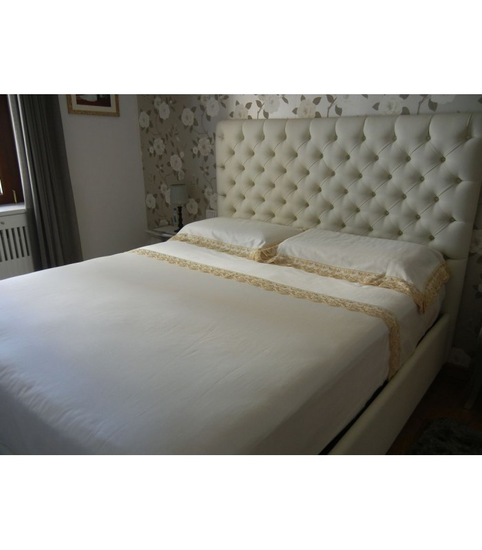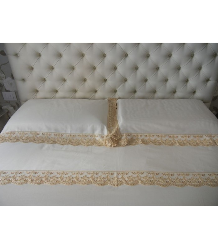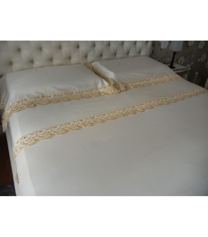 Completo lenzuolo matrimoniale in puro raso di cotone e pizzo.