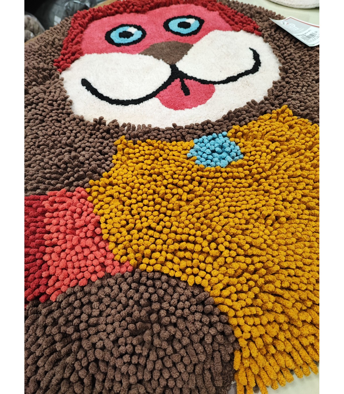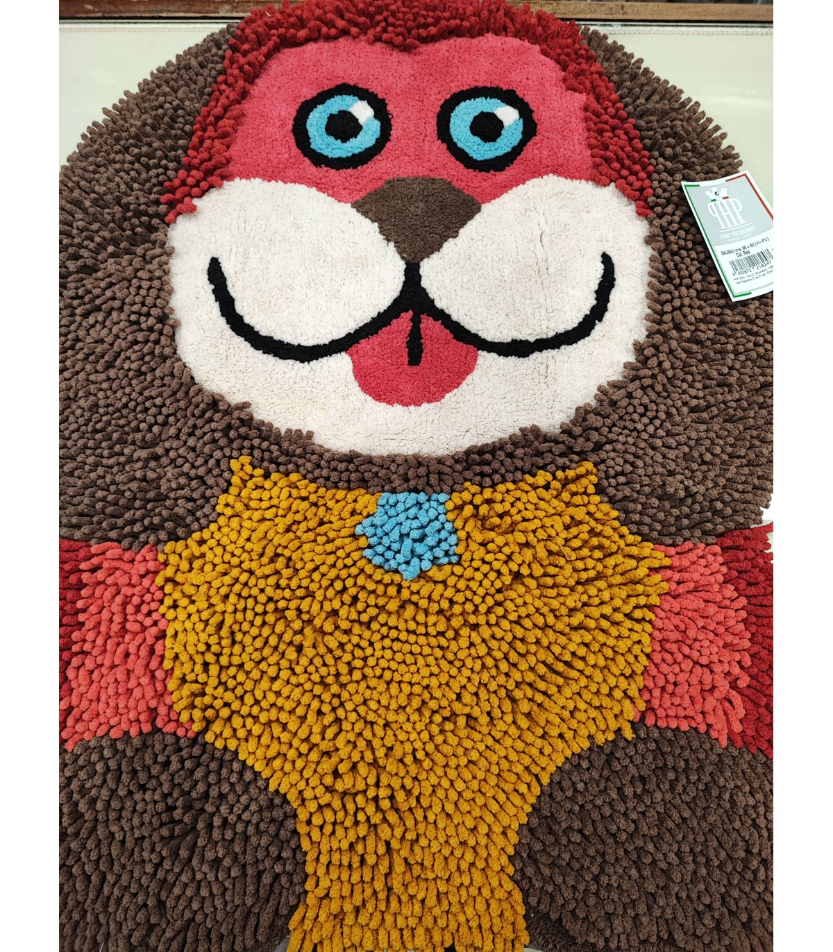 Il tappeto è sagomato, in ciniglia di puro cotone, con particolari in velluto unito, colori solidi e resistenti al lavaggio, tinto senza l'utilizzo di sostanze azoiche.