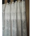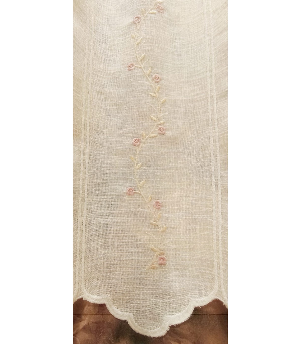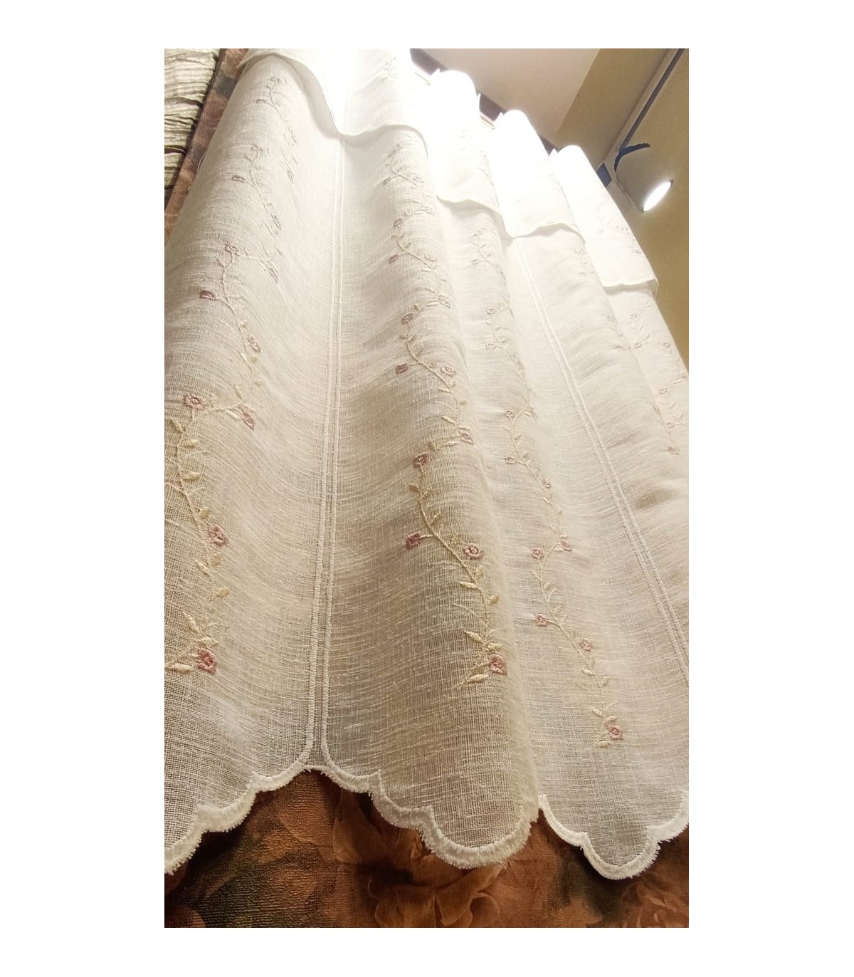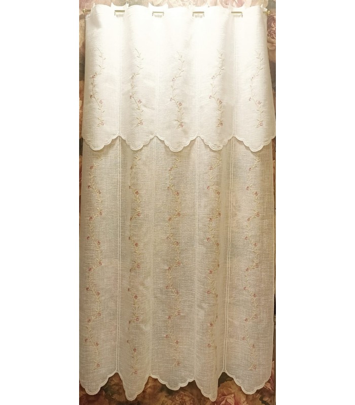 Tendina a vetro con mantovana, in misto lino, con smerlo. Il delicato disegno, di colore rosa, è ricamato lungo tutta la tendina. Il prezzo indicato intende una mantovana da 80x45 cm. e una tendina larga 80 cm. adatta per un vetro da 60 cm. e disponibile in due lunghezze: 120 cm. per una finestra corta oppure 210 cm. per una porta finestra.