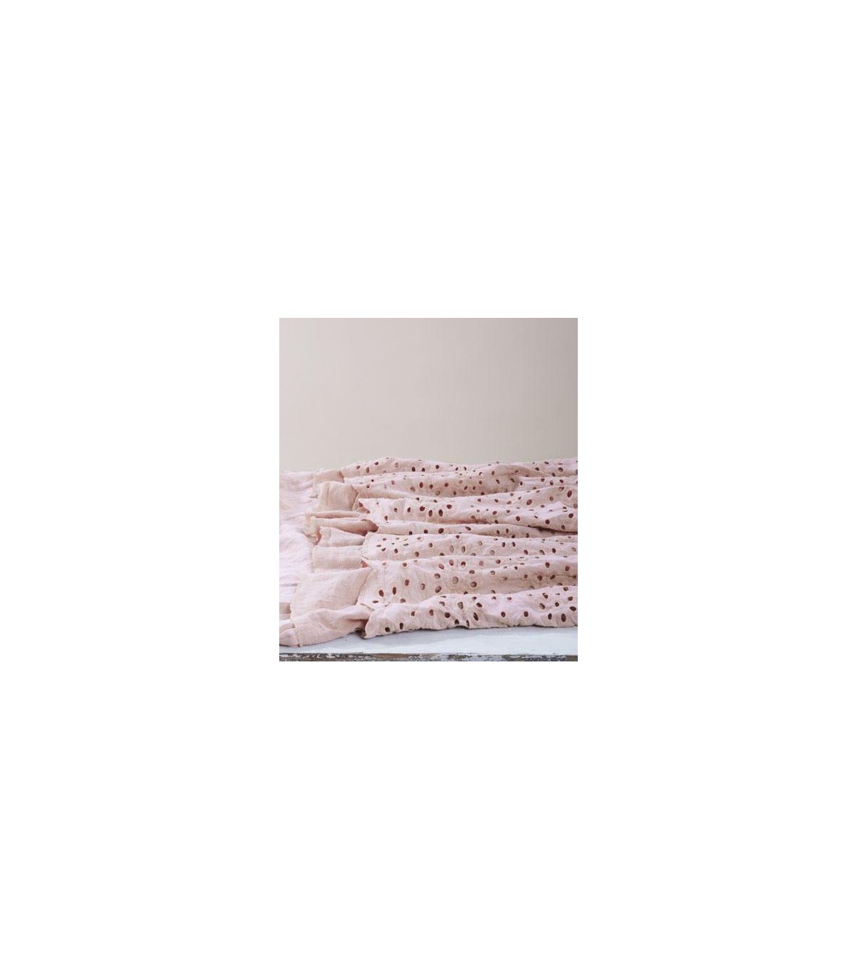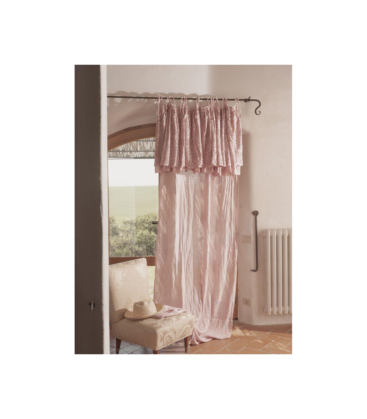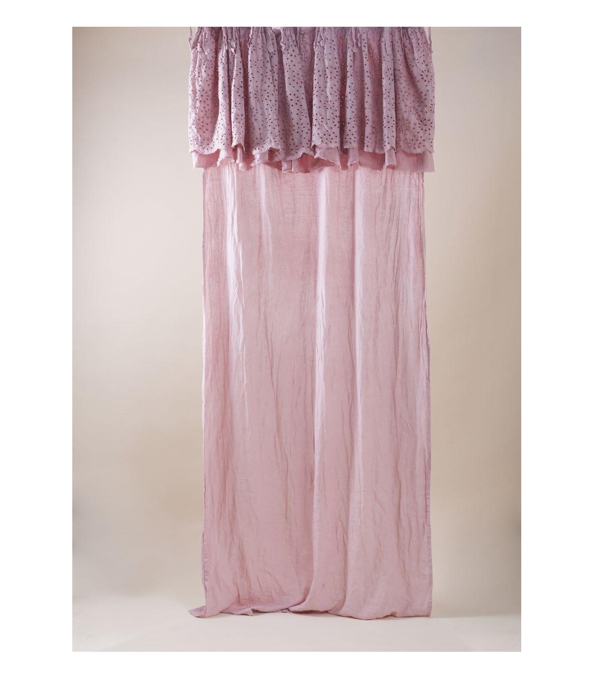 Pannello tenda in lino con doppia mantovana: la più corta è in pizzo ricamo S.Gallo di cotone e la più lunga in tessuto di misto lino.