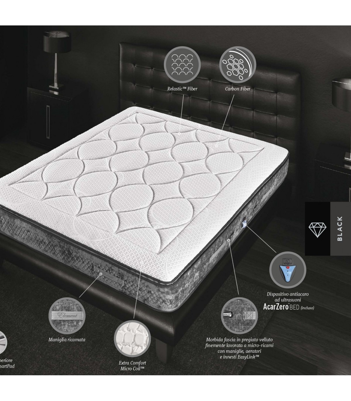 Pannello superiore rimovibile in innovativo tessuto strech con inserti in filo di Carbonio per assorbire le cariche elettrostatiche accumulate dal corpo durante il giorno e creare un effetto barriera contro l'inquinamento elettromagnetico. Trapuntatura volumizzante progettata per incrementare la sofficità delle imbottiture. Nella parte inferiore speciale tessuto volumetrico tridimensionale che assicura una elevata traspirabilità. Morbida fascia perimetrale in pregiato velluto finemente lavorata a micro-ricami, con 6 maniglie, 4 aeratori e 2 innesti EasyLink brevettati per l'aggancio del dispositivo antiacaro ad ultrasuoni AcarZero BED (incluso)